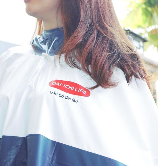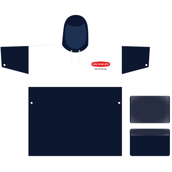 Áo mưa được thiết kế phối xanh – trắng giúp làm nổi bật thương hiệu Dai-ichi Life được in màu ở trước và sau lưng, cũng giúp sản phẩm bớt bắn bẩn, xuống màu theo thời gian sử dụng.