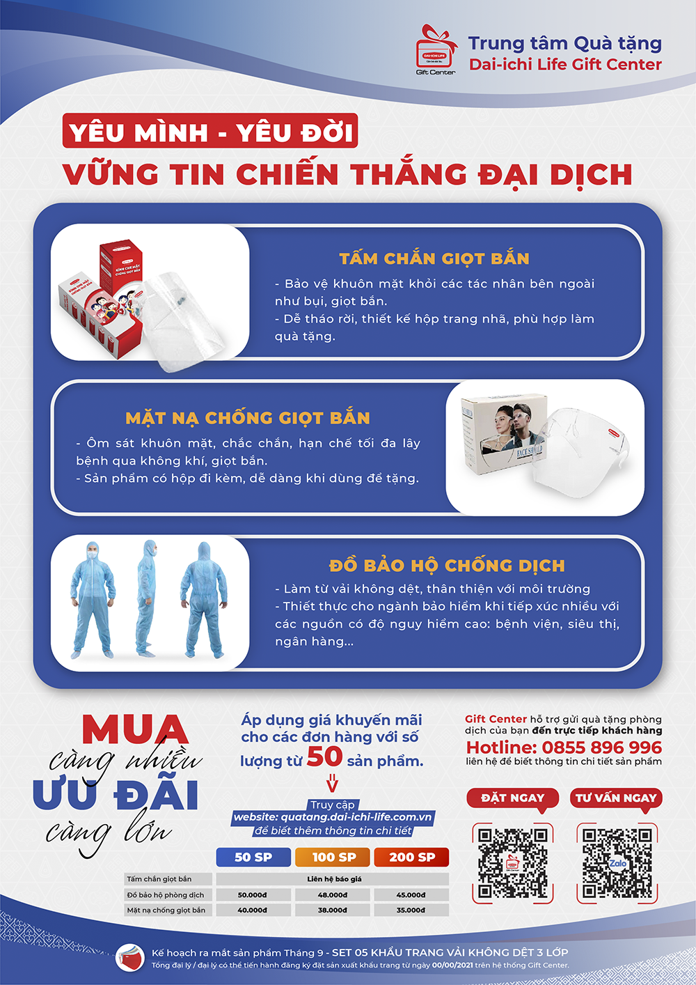 Bộ sản phẩm quà tặng mùa dịch không chỉ với tiêu chí chất lượng mà còn giúp bảo vệ khách hàng khỏi các tác nhân gây hại trong mùa covid hiện nay, đây là mong muốn mà Dai-ichi Life Gift Center hướng tới việc chung tay bảo vệ mọi người một cách tốt nhất - cùng nhau chung tay chiến thắng đại dịch.